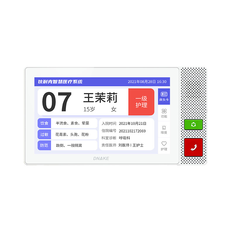 安裝在病床頭的交互設備機,代替?zhèn)鹘y(tǒng)紙質卡。產品支持呼叫對講、為住院患者提供病例查詢、狀態(tài)自動提醒等護理需求等。