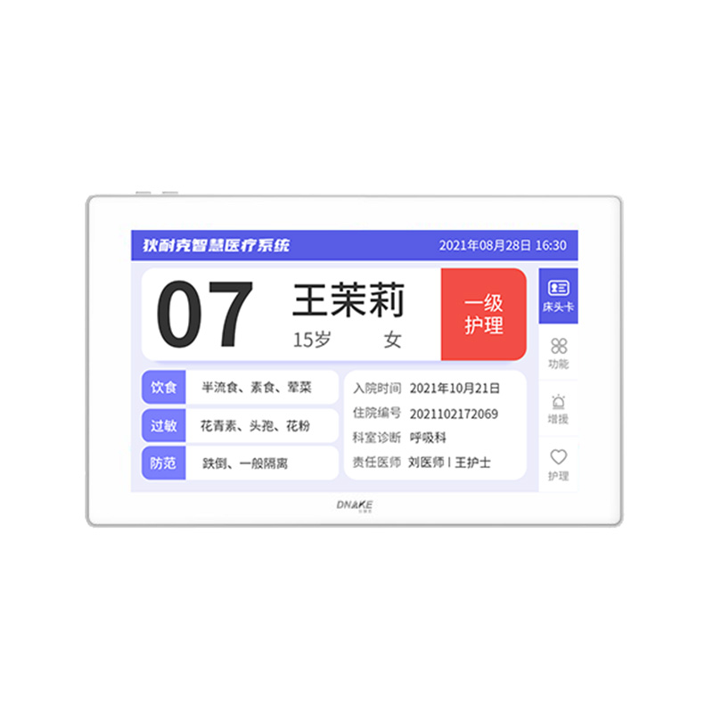 安裝在病床頭的交互設(shè)備機(jī),代替?zhèn)鹘y(tǒng)紙質(zhì)卡。產(chǎn)品支持呼叫對(duì)講、為住院患者提供病例查詢、狀態(tài)自動(dòng)提醒等護(hù)理需求等。