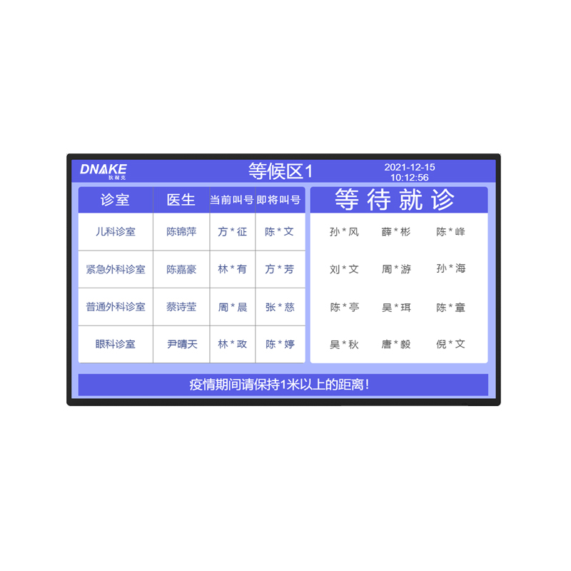 安裝在門(mén)診等候大廳,用于隨時(shí)得知患者等候科室的叫號(hào)順序,便于患者提前準(zhǔn)備前往科室,緩解患者在等候過(guò)程中的焦慮情緒。